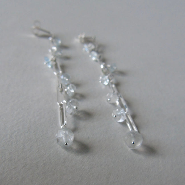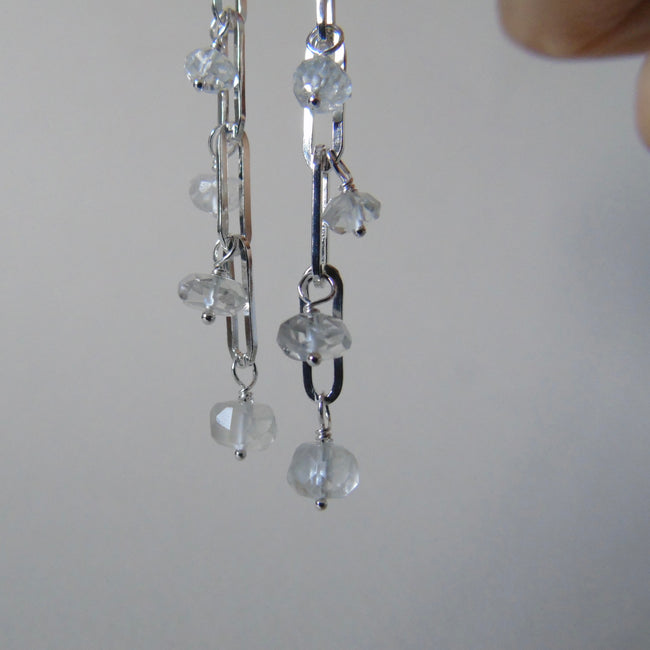 A pair of silver long drop stud earrings. A paperclip chain drop with a little graduated sparkle of faceted rondelle aquamarine beads on each link.