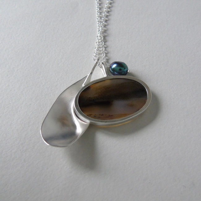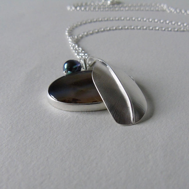 One-of-a-kind silver charm cluster necklace comprising of a silver bezel set Montana agate, a siver feather charm and a iridescent pearl bead.