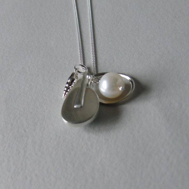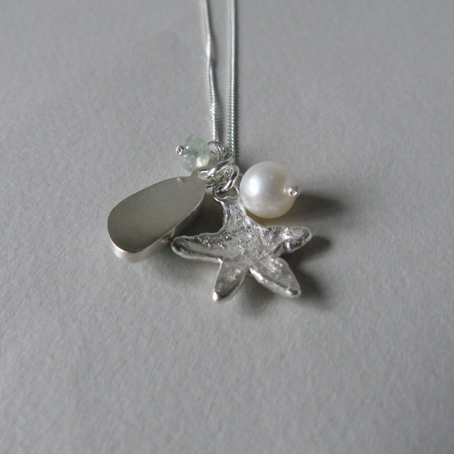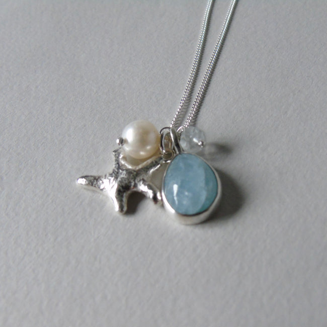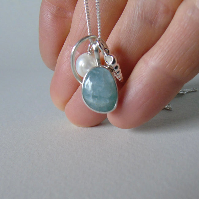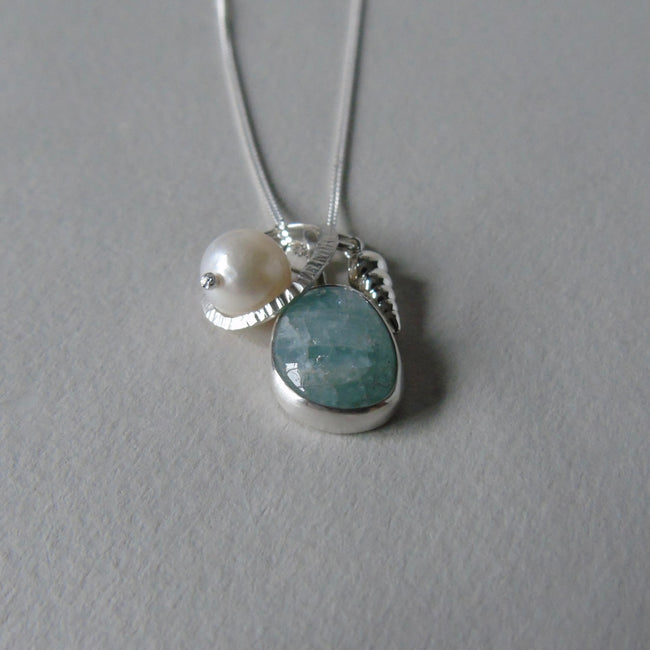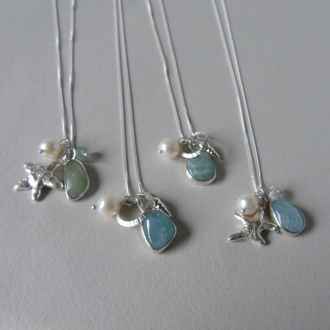 Silver charm cluster necklaces with simple bezel set aquamarines. Inspired by the beachcombing finds and the colours of the sea on a summer's day.