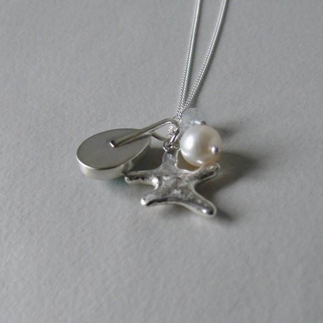 necklace D - the aquamarine charm cluster is approx 1.8cm wide and 2.4cm long from top of the bail to the bottom of the starfish. The blue aquamarine stone is a smooth freeform cab and measures 15mm x 10mm. The handmade starfish charm is approx 1.8 x 1.8mm The beads are a creamy pearl and a faceted rondelle aquamarine.