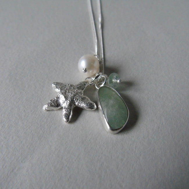 necklace A - the aquamarine charm cluster is approx 1.8cm wide and 2.4cm long from top of the bail to the bottom of the starfish. The green aquamarine stone is a faceted freeform cab and measures 17mm x 8mm. The handmade starfish charm is approx 1.8 x 1.8mm. The beads are a creamy pearl and a rondelle aquamarine.