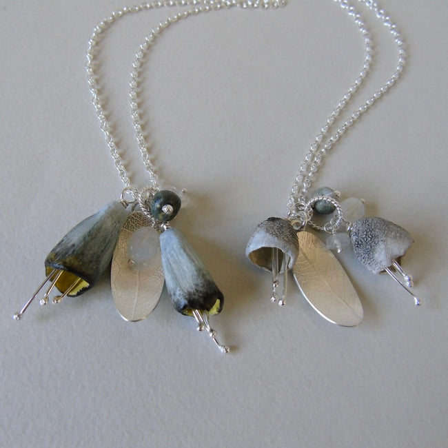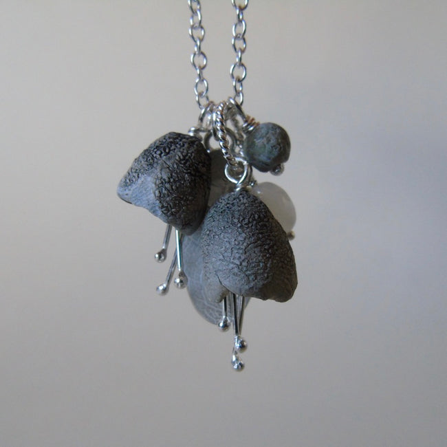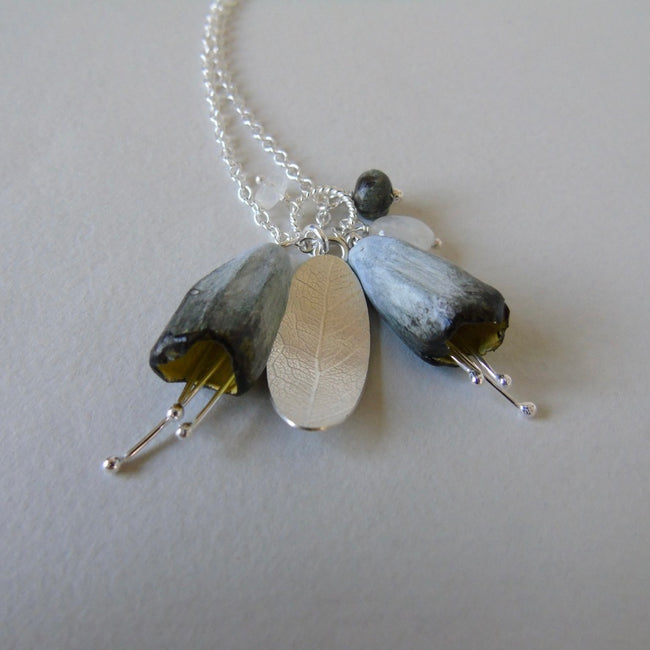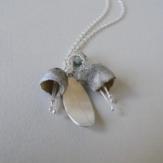 Silver charm cluster necklace comprising a large silver leafy charm, two porcelain pod charms, a silver loop and two rainbow moonstone beads.