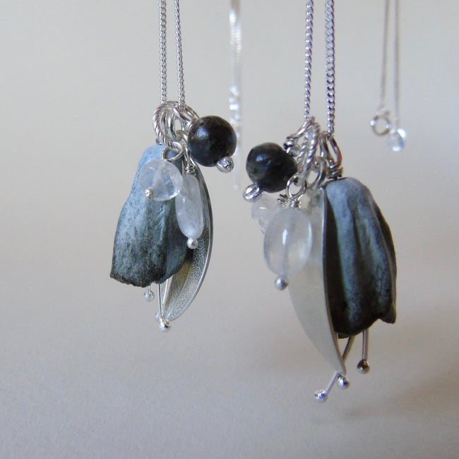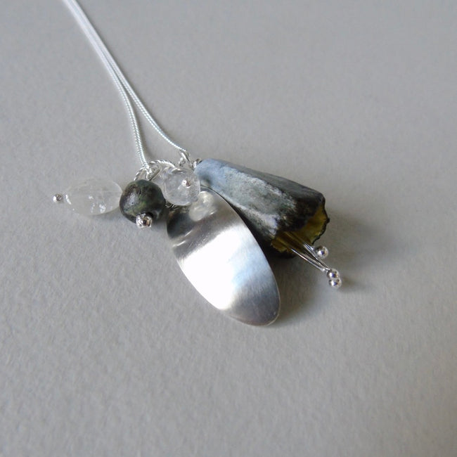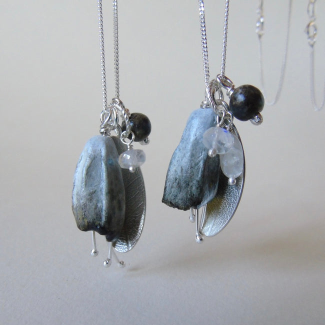 Silver charm cluster necklace comprising a large silver leafy charm, a porcelain pod charm and little porcelain bead, a silver loop and two rainbow moonstone beads.